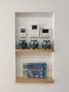 上部にはスイッチをまとめ、下部には冊子や小物をきれいに収納📚