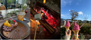 夕方は冷え込んできたため、カフェでひと休み。外では焚き火が行われており、マシュマロやチーズを炙る体験もできました。