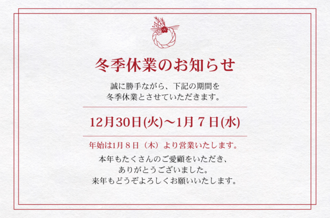 冬季休業のお知らせ 平素は格別のご愛顧賜り心より御礼申し上げます。 弊社では誠に勝手ながら、本年度の冬季休業を以下の日程で実施させていただきます。 ■...