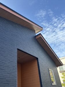 アクセントとしてブラウンの外壁と木目調の軒天を組み合わせ、素材感に統一感を持たせています。
