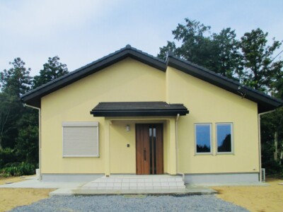 特徴はお客様の強い要望から、外壁を塗り壁仕上げ、内側をしっくい壁、床材に無垢床材を使用したことです。